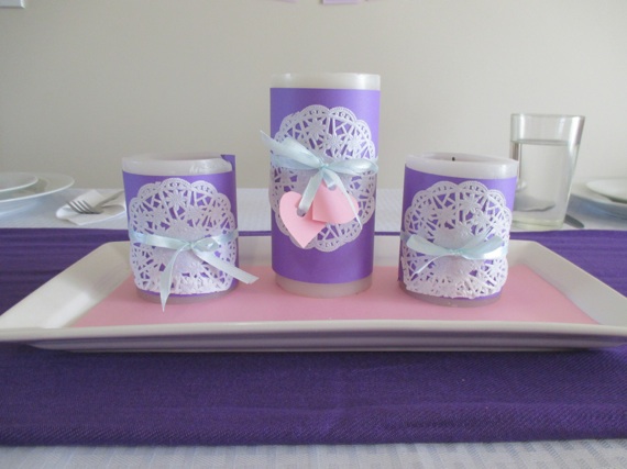 Just as the candles look more interesting with layers of detail, the centerpiece looks more attractive with layers of materials. Start with a white tablecloth. Next layer on a purple table runner. This one is actually a scarf, but 2 or 3 sheets of purple paper would work just as well. Next a white plate is placed in the middle of the runner, then a pink piece of paper is cut to fit the inside of the plate. Finally the candles are arranged on this base. Three white candles on a bare table would not look very interesting, but adding lots of layers and details to the candles makes them an appealing centerpiece.