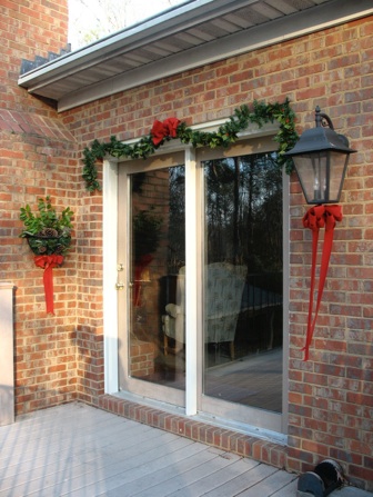 Ribbon is another inexpensive way to add lots of splashes of red--on the swag above the doors, and on the bottoms of the light and flower basket. If your door has a lot of direct sunlight, fresh greenery is going to go brown very quickly. If it is in the shade, it can last for months. Artificial swags can be an inexpensive alternative. If you add fake holly to a fir swag, it adds bits of red, and makes it more interesting. Pinecones can be added as well.