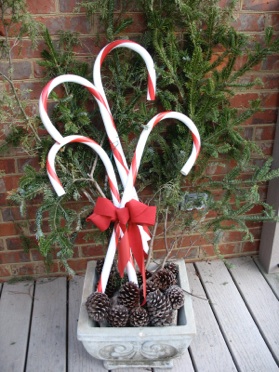 Giant candy canes are sold at some dollar stores, which keeps this a really inexpensive decoration. The container needs to be quite heavy to keep it from toppling, especially if it gets windy. If you don’t have a heavy container, you can fill a light container with rocks, then cover them with pinecones. The trio of candy canes, bow, and greenery, can be a versatile decoration--it can be a wreath alternative for the front door, a wall decoration, or decorate each post along a railing