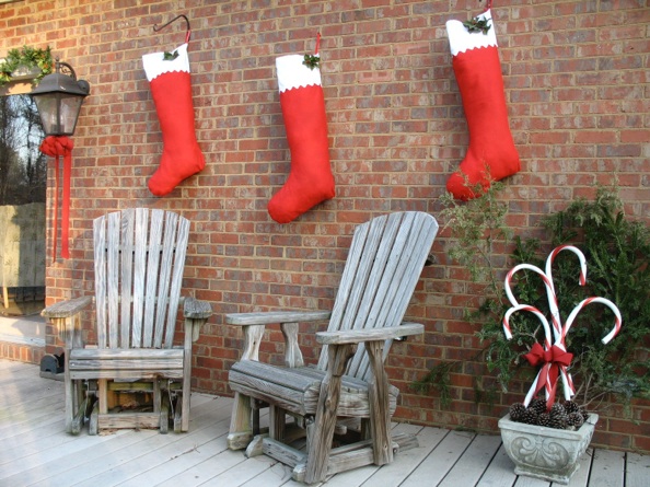 Big spaces need big decorations, which usually cost a lot of money (or look really tacky!) The dollar store can come to the rescue with giant felt stockings. One stocking might look a little lost, but a row of 3 fills the space nicely. Fill them with empty plastic shopping bags, and the stuffing doesn’t cost a thing! You could even put a few toys peeking out of the top--just make sure the loops are strong, or you may end up with the stockings on the floor, and if there are dogs around, the toys might get chewed up! If you can’t find inexpensive big stockings, you can sew or glue some fairly quickly. Another decorative touch is to pin some holly to the tops of the stockings.