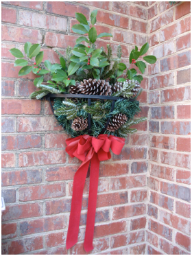 A flower basket can make an interesting alternative to a wreath. If you get a real Christmas tree, you can use trimmed branches to fill the basket, or trim trees and branches from the yard. If these are not available. use artificial branches. Whether you use real or artificial branches, you can use an artificial swag to fill the basket and hide the ends of the branches.