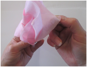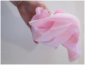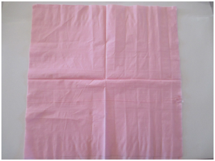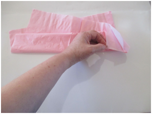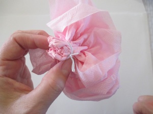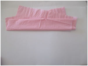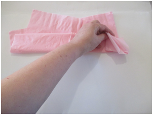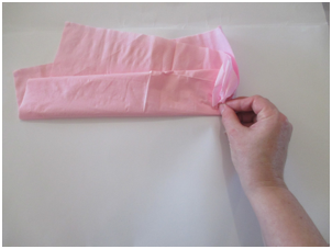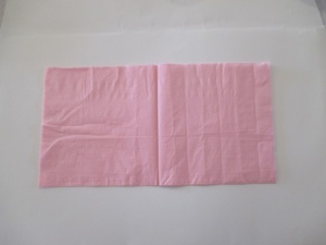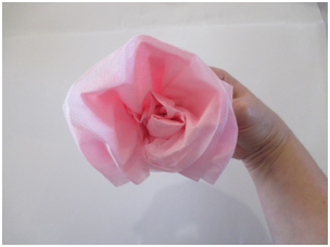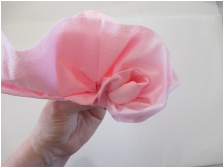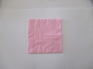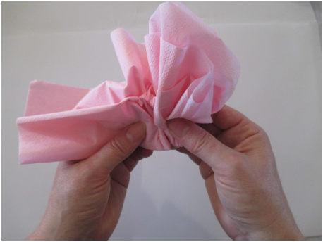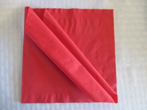 Open a paper napkin all the way so it is a large square. Note: if you do not have colored napkins, stack 3-4 sheets of colored tissue paper for each flower so you can have layers of petals. Cut the paper into 30 cm. squares. Start folding as in the step shown below.