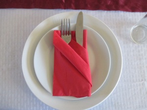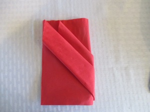 Fold the right side to the back, and put silverware in each “pocket.” This is a very flimsy pocket, so it is best to put the folded napkin on the table or plate, then slide the silverware in last; if you put the silverware into the napkin before you move it in place, it may fall out, and you will have to fold the napkin again.