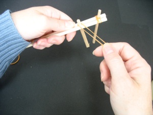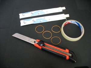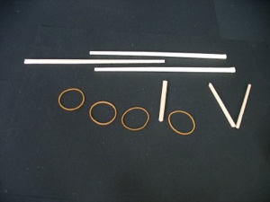 You will need 2 pairs of disposable chopsticks (or 4 dowels), 4 rubber bands, scotch tape, and a box cutter or hand saw.