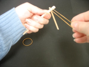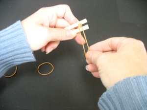 Fasten the handle pieces together at the bottom by placing one rubber band around one short piece.