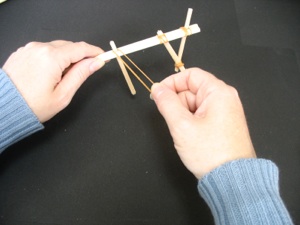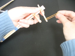 Slide the second handle piece between the two open sticks, and fasten it in place with a rubber band as explained for the first one.