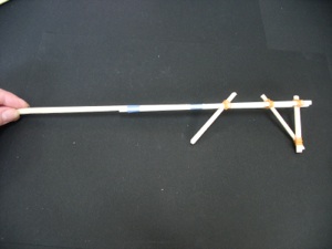 Place one stick between 2 sticks, overlapping about halfway, and tape them in two places as shown in the photo. This forms the barrel.