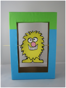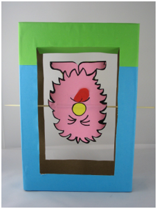 3.Cut the monster’s body out of 2 colors, so it looks like it turns colors when you hit it with a rubber band and make it spin around so the back shows.