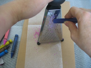 3.Grate bits of old crayons onto one piece of wax paper.