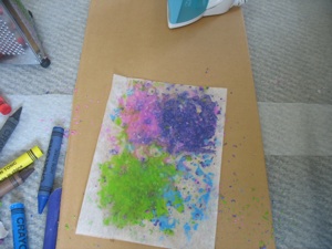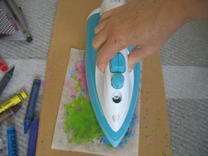 4.Lay the other piece of waxed paper on top of the piece with the crayon and iron over it until the crayon bits melt. (this should only be done with adult supervision.)