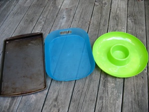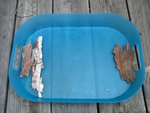 The biggest challenge for making an Easter garden is to find a water proof container that is big as well as shallow, and cheap. Be creative, and don’t let the intended use of a container keep you from thinking of using it for an Easter garden. An old cake pan or cookie sheet that you are thinking of throwing away anyway, can be a container. Or a large water bowl for dogs might be perfect. The dollar store had a chips and salsa container, so although not ideal, it is useable, and certainly cheap! I decided to use a plastic tray from Walmart, and used bark to block the dirt from falling out of the holes on the sides. If you really want to go big, you could use a child’s wading pool--perfect for a large church foyer!