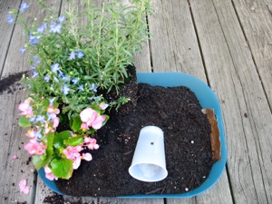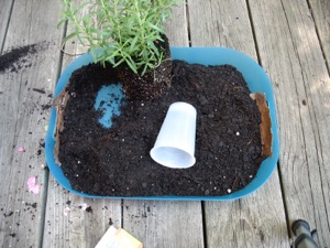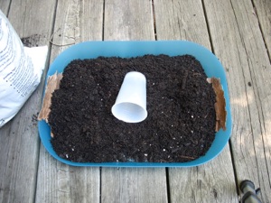 Fill the tray with soil. Make sure the dirt is moist so it will it’s hold shape. Put a plastic cup or flower pot in the middle to form the grave. You could also use a can or jar instead.