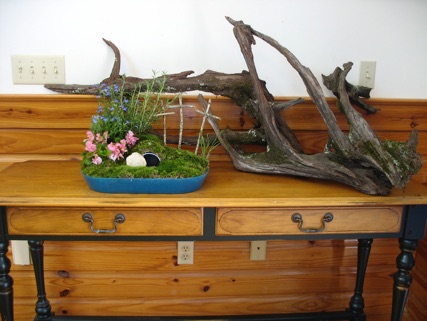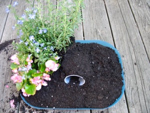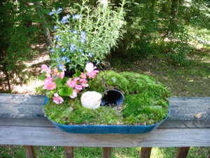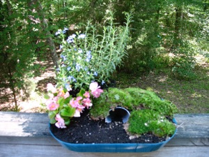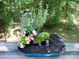 Dig holes for the plants and fill with small potted flowers and pants that look like trees or bushes. This rosemary looks like a tiny tree.