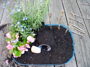 The dirt needs to be deep enough to hold the crosses upright. Be sure to cut the sticks longer than typical crosses because these are pushed into the dirt--if you make them in the typical proportions, they will look funny with the bottom half hidden in the dirt. Tie or glue the cross pieces on before you stick them in the dirt. Add a rock to the grave entrance, and the garden is finished....unless...