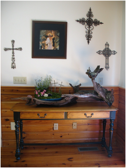 You can add more details that will deepen the meaning as well as make the display larger, which is particularly important for larger spaces, such as a church. This drift wood represents death that was not able to keep Jesus in the grave. He broke the bonds of death and rose again.