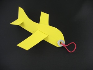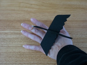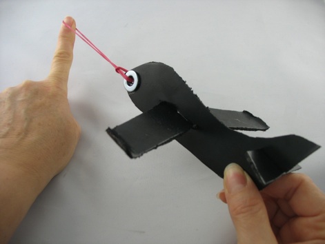 11. Put the rubber band over the end of one finger. Point your finger up at an angle. Pull the airplane back with the other hand and let go. Watch it fly.