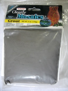 After the glue dies, spread grout between the glass or tile pieces. Follow package instructions. Let dry. Grout can be purchased at craft stores and hardware/ home improvement stores. If possible, glue thin strips of wood or trim around the edges of the plywood and tiles to keep the grout from chipping off the edges.