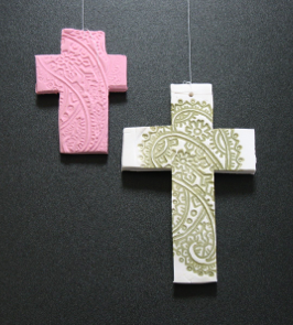 Stamps are an easy way to add texture to a project. If you stamp without ink, it looks like the pink cross shown above, and if you stamp with ink, it looks like the green and white cross. Be sure to wash the stamp thoroughly so the clay doesn’t dry in the grooves of the stamp. If the clay is so sticky that it fills the grooves of the stamp, wash off the stamp, let the clay dry a few minutes, re-roll the clay, and stamp it again.