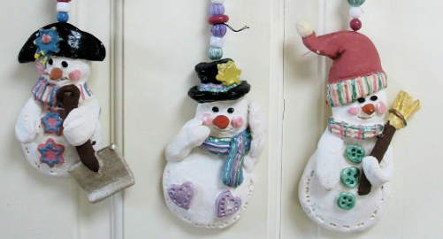 Scissors are another easy way to cut out shapes. Roll the clay very thin, then use scissors to cut strips to form a bow or scarf for snowmen--cut a fringe on the ends, too. These extra thin pieces are fragile once they dry, so it is better if they are attached to thicker pieces before they dry. Scrapbooking scissors or pinking sheers can be used, too, such as for making carnations, etc. This thin clay needs to be just the right consistency to work with. If it is too dry, it will be brittle and crack when you try to shape it. If it is too wet and sticky, it is hard to pull it off the surface without tearing or stretching it. If it is too dry, wet your hand and kneed in the dampness. Repeat until it is easy to work with. If it is too wet, kneed for a few minutes without water, to help it dry out uniformly.