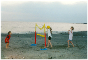 All you need is a net and ball. A beach ball, rubber ball or real volley ball can be used. Save the real volley ball for older children, because it can really hurt to hit it with your hands, even for adults! Setting up a net can be a bit tricky, but if you are creative, there are many ways to make a net. If you have 2 anchor points that won’t fall over with some tugging (trees, poles, windows, swing set, jungle gym, or basketball goal), you can tie a rope between the two points to represent the net. If you want it to look more like a net, tape newspapers, clear plastic bags, or netting to the rope. The net shown here was purchased at a toy store. It is a set that also makes a soccer goal, tennis net, hockey goal, and basket ball goal. Check out Wikipedia for rules of the game if you are unsure how to play the game.
