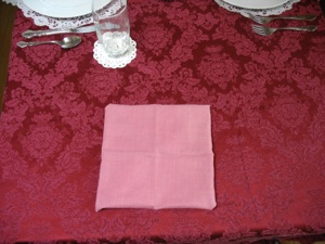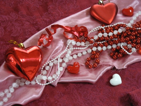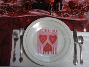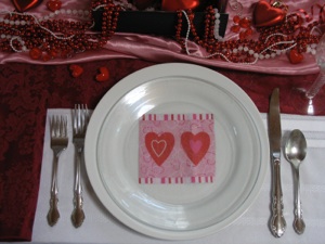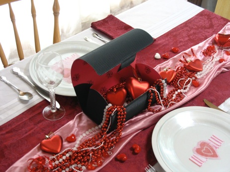 Whether you are planning a quiet dinner for two, or plan to include the kids for your Valentine dinner, a treasure chest is an exciting option (especially for kids!) It only takes about 5 minutes to put together once you have gathered the materials. The only tricky part is finding a treasure chest--this one was a cardboard box that someone gave us cookies in. But all is not lost if you can’t find one--I have instructions for 3 different ways to make one. Layer a pink satin cloth, as a table runner, on top of a dark red tablecloth. Put the treasure chest in the middle, then pile on the beads and ornaments.