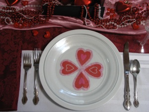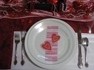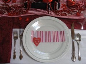 A dark table cloth will show off the doilies the most, but a pink tablecloth would look pretty, too. It may be easier to find paper heart doilies than crocheted ones, which will work just as well. You will need clear glass plates to show them off, and skip the white plates, unless you want a subtle white-on-white effect. To make a napkin ring, tie a bit of ribbon through the heart and around the napkin, and embellish the ribbon with beads if you like.