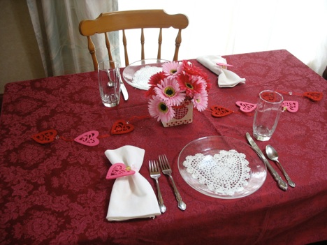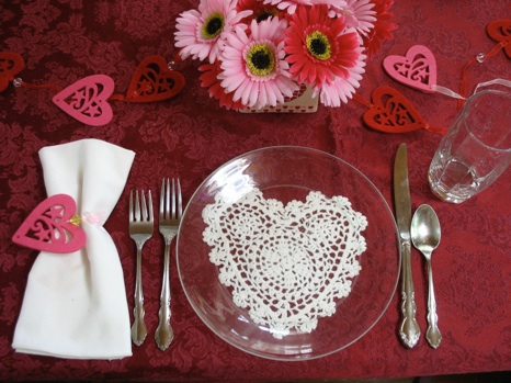 Keep the flower arrangement short so you can see each other across the table. Dress up a simple arrangement with felt hearts as a table runner. If you can find felt hearts and doily hearts at a dollar store (hundred yen store) this table decorating is as quick as it is inexpensive. If your husband brings you flowers, by all means use them as a centerpiece. But if he doesn’t, treat yourself! No one said the flowers had to be real--these flowers, along with the vase, are also dollar store specials. Every Valentine’s Day, I would pull them out of the box, and put them somewhere--sometimes as a centerpiece, and sometimes next to the bathroom sink. They made me smile every time I saw them, even though I knew they were fake. Even my gardening friend couldn’t tell they weren’t real!
