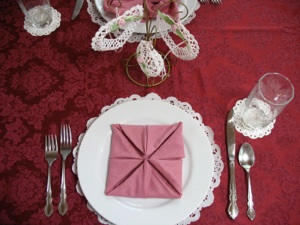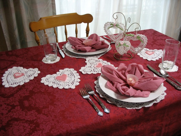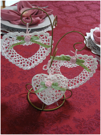 Make the whole table into a valentine with crocheted doilies or paper heart doilies. Scatter them down the middle of the table, and hang some for a centerpiece. This stand is made for hanging Christmas ornaments, so if you look for a stand locally, it may be easier to find around Christmas, but some gift shops sell them year round. The napkins folded like flowers are center stage here, but layers of detail add more interest with paper doilies under the plates and glasses.