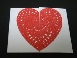 Instead of folding the paper in half, fold it to the middle. Glue a heart doily on top, then carefully cut it along the slit so the card can be opened.