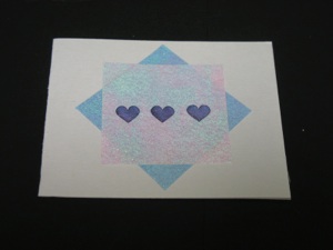 Glue 2 small squares of paper to the card. Glue a row of hearts in the middle--these can be stickers, sequins, or use a heart-shaped hole puncher to make the shapes.
