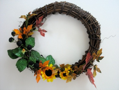 A fall wreath is easy to make--just buy “silk” flowers, leaves and fake berries, and fasten them to a vine wreath with florist’s wire. It’s not hard to make the vine wreath if you can find vines, but if not, they are relatively cheap to buy at craft stores. Another source is to buy one at Christmas time when many stores sell them, but instead of decorating it for Christmas, decorate it for fall.