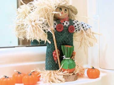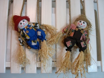 An alternative decoration is to hang scarecrows from the fence. These were purchased at a hundred yen store, too. If you can’t find any in a store, make your own. Wrap fabric around a styrofoam ball and paint a face on it (styrofoam balls are sold at 100 yen stores, and craft stores). Or stuff the end of a white sock with batting and sew a face on. If sewing clothes and hats seems too daunting, see if your local hundred yen store (or dollar store) has clothes and hats for teddy bears. Many craft stores sell them, but that can get pricey. Finally, tie raffia (or weeds) where the hands and feet would come out of the shirt and pants.