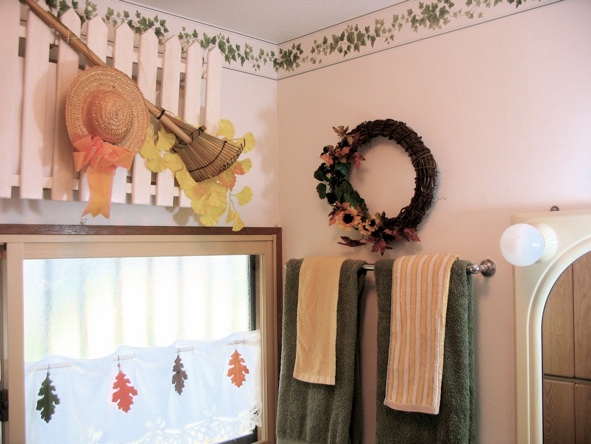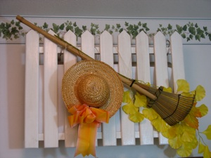 Fall leaves, a hat with with an orange ribbon, a rake, all evoke images of a crisp fall day with a pile of leaves to play in. These items, purchased at a hundred yen store, are hung on a picket fence that hides the breaker box. The picket fence was made out of sunoko that was cut to look like a picket fence, and painted white. (Sunoko are wooden lattices that are used in Japanese closets to allow air to circulate under items stored in them.) (This one cost 250 yen at Keiyo D2.) The “fence” is hung from two brackets mounted on the wall. The brackets were created for holding a narrow shelf, and were purchased at a hundred yen store.