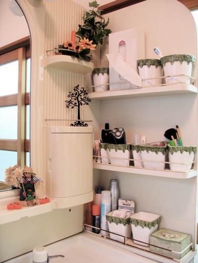 The items we use daily, such as toothbrushes and makeup, are kept organized in flower pots,( from the hundred yen store, of course.) This frees up some space, so I can decorate on the shelves next to the mirror. On the shelf under the mirror, there is a cute little scarecrow and a patch of candle pumpkins. On the shelves to the right of the mirror, an orange candle is surrounded by cheery sunflowers, and the next shelf down has a black metal tree. All these items were purchased at hundred yen stores.