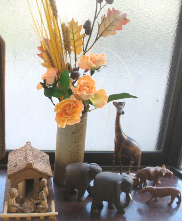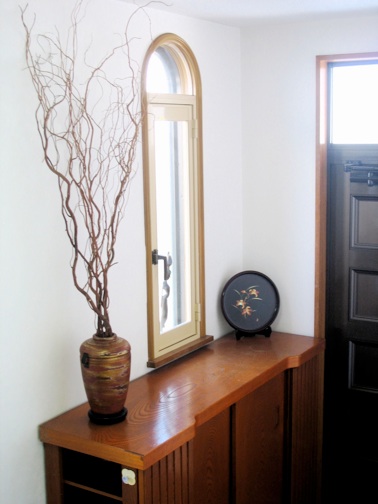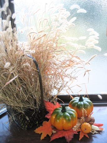 These pumpkins (purchased at a hundred yen store) were too small to display alone. By adding the basket (from the hundred yen store, too) along with the dried weeds that were growing on the side of the road, it made the arrangement big enough to fill the space nicely. Finishing it off with a few fall leaves and a floral pick made a very inexpensive fall arrangement for my bay window.