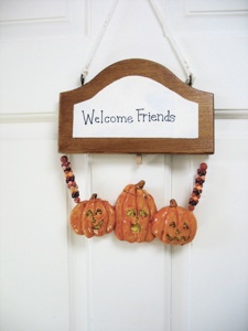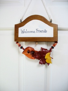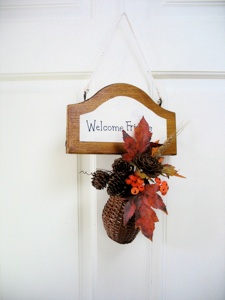 This wooden welcome sign has miniature clothespins glued on the back so that the seasonal decorations can be easily changed. The two decorations on the left are generic autumn decorations, and could be used all fall. The leaves on the left are made from a light weight air drying clay such as Hearty (Karui Kaminendo.) Real leaves were used for patterns. The next sign over has a basket (from the hundred yen store) hanging from the middle clip, filled with “silk” leaves, pine cones, and fake berries.