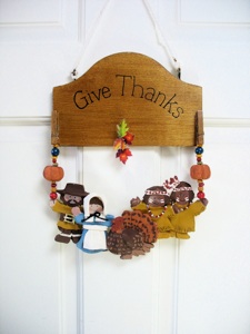 These decorations are made specifically for Halloween and Thanksgiving. These decorations are also made of Hearty (Karui Kaminendo, sold at 100 yen stores.) The pumpkins were made freehand with the mouth and eye holes indented with the blunt end of a toothpick. They were painted yellow as if illuminated from inside, then rimmed in black so they show up better. The Pilgrims, Indians, and turkey were cut out with cookie cutters, then embellished with buckles and beads, apron, hat and bonnet.