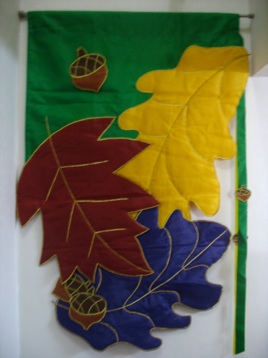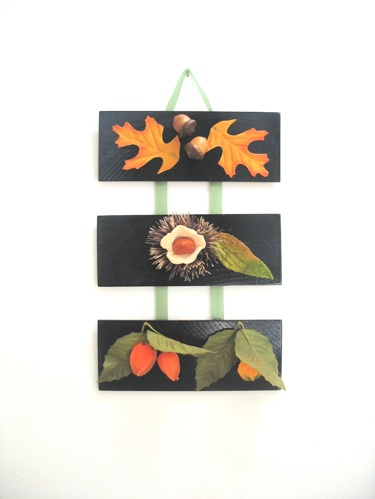 This fall decoration has an oriental flair. The wood plaques were painted with a black stain/varnish combination, then joined with a green ribbon. The chinese paper lanterns and chestnut were purchased at a hundred yen store. I pulled apart the chestnut spines, glued them to the board, then added the chestnut meat and and surrounding covering that I made out of Hearty (Karui kaminendo, sold at 100 yen stores.) The wooden acorns were purchased from an American craft store and varnished, but would be easy enough to make out of Hearty, too. I paired the acorns with “silk” oak leaves