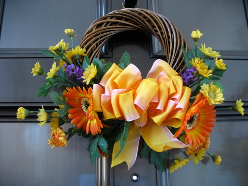 This vine wreath is huge, so it took 2 sunflower bushes and two leaf bushes to fill it out. Since I made the wreath myself, it only cost about $5 to make, since the flowers and leaves came from a dollar store (hundred yen store), and the ribbon came from Costco. Craft stores sell them, too, but usually cost more.