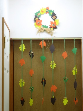 Wreaths come in so many sizes, shapes, and materials that you can display many without feeling redundant. The wreath pictured here is made of foam, and easy enough for your children to make. The sets come in packs of twelve, so you can invite a dozen friends over to make some, too. Any left overs can be used to make a decoration for a doorway--staple extra leaves to ribbons to hang in the doorway as a variation of a bead curtain. Kids especially like to walk through these.