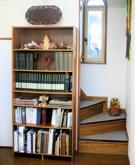 I like to leave empty spaces on my bookshelves for places to add some seasonal decorations-- The top shelf has some miniature indian corn and for height, a cornhusk doll (my daughter made in middle school), and some fall items from a dollar store--turkeys and ships. Below that is a berry wreath from a dollar store (hundred yen store) that is hung from a metal stand. Below that is a scarecrow with some tiny styrofoam pumpkins. (For close-up photos of the cornhusk doll, see fall centerpiece photos, and for the tiny scarecrow, the look at the bathroom decorations.)