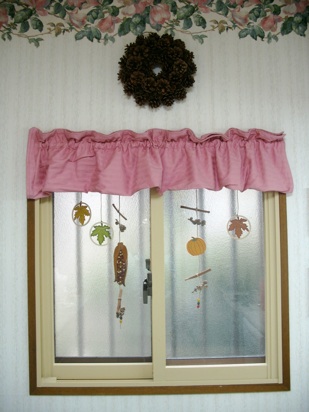 These wooden cut outs are tied with twine, and are combined with cinnamon sticks and short branches of acorn caps--just enough to decorate, but not so much that it blocks the light from the window. Look for wooden shapes at dollar stores or craft store. A pine cone wreath, also from a hundred yen store, is above the window--in keeping with the fall theme, but not the bright orange to clash with the pink valance. You can make a pinecone by gluing pinecones to a wreath base.