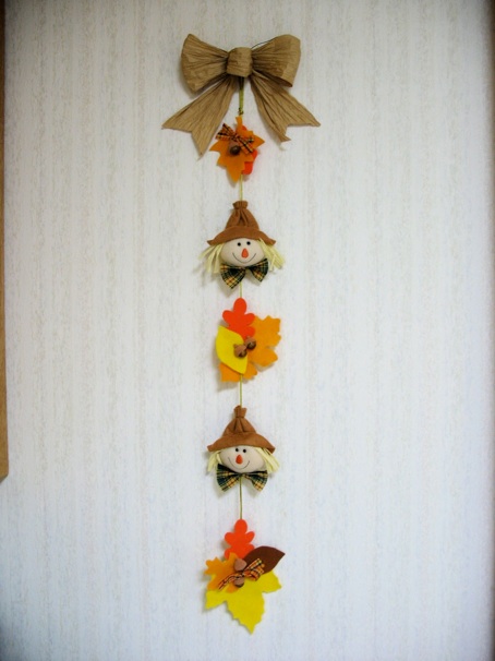 These cute scarecrows were purchased at a hundred yen store, but they seemed a little skimpy by themselves. So I cut out more felt leaves, added them along with some bead “acorns,” and tied a paper bow at the top (I used the handles from a paper gift bag, untwisted them, then tied them in a bow.)