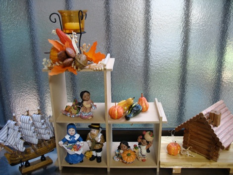 The Pilgrim and Indian figurines, as well as the ship, were all purchased at American dollar stores. The orange candle was purchased at a hundred yen store. It seemed a little plain by itself, so I added the floral pick at it’s base. Seasonal floral picks are sold at craft stores, dollar stores, hundred yen stores, and Japanese department stores that sell seasonal items. You can also make them yourself, by bunching “silk” leaves, and nuts or pine cones and fastening them all together with florist’s wire.
