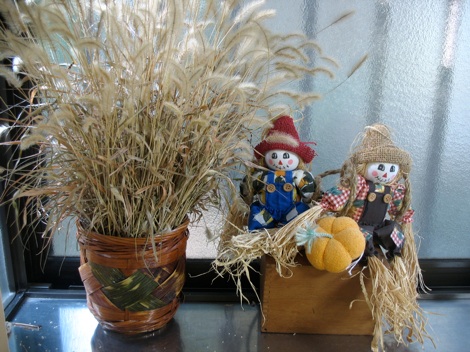 These scarecrows were purchased at a hundred yen store. Dollar stores sell them, too. I set them on a wooden box, and added a fabric pumpkin. The basket was also a hundred yen purchase, and the dried plant was a weed that I picked from the side of the road that had been growing in a crack in the pavement.