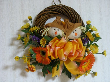 An alternate way to use the cute scarecrow faces from the hundred yen store or craft store is to add them to a wreath with fall leaves, or fall colored flowers.