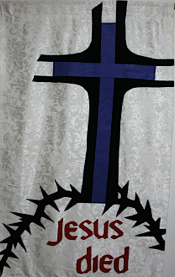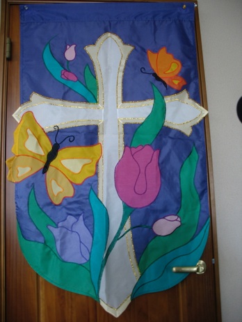 Banners are a great way to dress up the church for Easter and make it feel more like a celebration. If you don’t do anything to make Easter Sunday distinctive, it will feel like every other Sunday. Therefore decorations can be an important part of making Easter special. Some churches hang banners year round, then for special occasions replace them with seasonal banners. It only takes a few minutes to hang a banner, so they don’t take as much time to decorate as other ornaments. If you make your own, you can choose the design that you want, and write the message with the emphasis you want to get across. Unlike flowers, they can be used year after year. Unlike stained glass windows, they are relatively inexpensive to make, so you can make new ones when you want a new look. I highly recommend the pattern books on the right, available through Christian bookstores, and online companies such as Christian Books and Amazon.