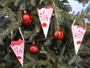 These paper cones are made with paper doilies and red paper cut into half circles and rolled into cones. Glue or staple them. Use poster board to make them last longer. Curling ribbon make good handles--glue or staple them on 2 sides, or punch 2 holes and tie the ribbon in place.