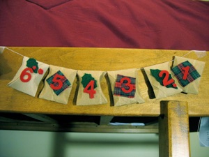 The ornaments on this tree-shaped advent calendar actually announce to the kids which Christmas activity will be done that day--the gingerbread house lets the kids know they will make a gingerbread house, the tree stands for the day to decorate the Christmas tree, the candy cane represents the day to eat candy canes, etc. There are 2 pockets for each day--one for the ornament of the day, and another one for a verse to read with part of the Christmas story when they are young, and Old Testament prophecy about jesus for when they grow older. The verses were written on pieces of paper that were rolled around toothpicks to make mini scrolls. The row of pockets across the bottom were for after Christmas to make sure thank you letters get written and mailed. This advent calendar takes quite a bit of time to make, but it lasts for years. This is the advent calendar that my kids grew up on, so it has lots of happy memories for our family. I kept intending to write the count down numbers on the ornament pockets and a holly garland on the verse pockets, but never got around to it. We used the count down chalk board, so we managed without them!
