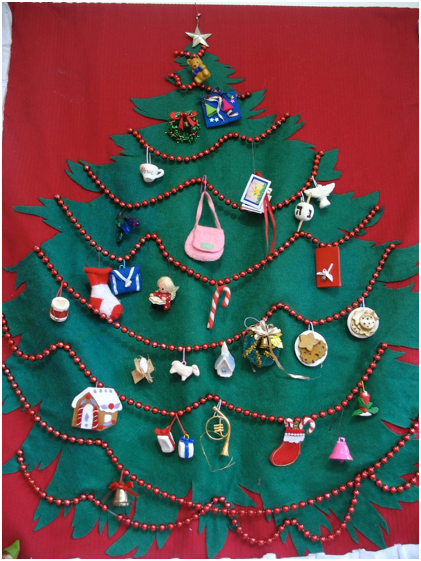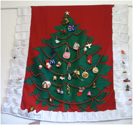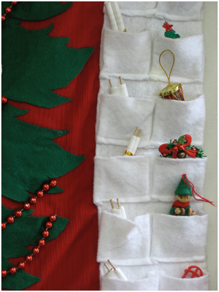 Use felt to make the tree and pockets so you don’t have to worry about raveling edges, but make the background out of regular fabric rather than felt because felt tends to stretch and sag over time. Hem the edges, and sew a sleeve or channel at the top to put a dowel through to hang the banner. This can all be done with fabric glue, but it is easier to sew, that is, if you have a sewing machine. Hand sew strings of beads to the tree to hang the decorations from. You don’t have to make pockets if that seems like too much work--you can just keep the ornaments in a box, and hand one ornament to be hung each day. Collect small toys and ornaments to hang on the tree, or make them from felt or clay such as model magic. Glue plastic coated paper clips to the ornaments to hang them from the beads.